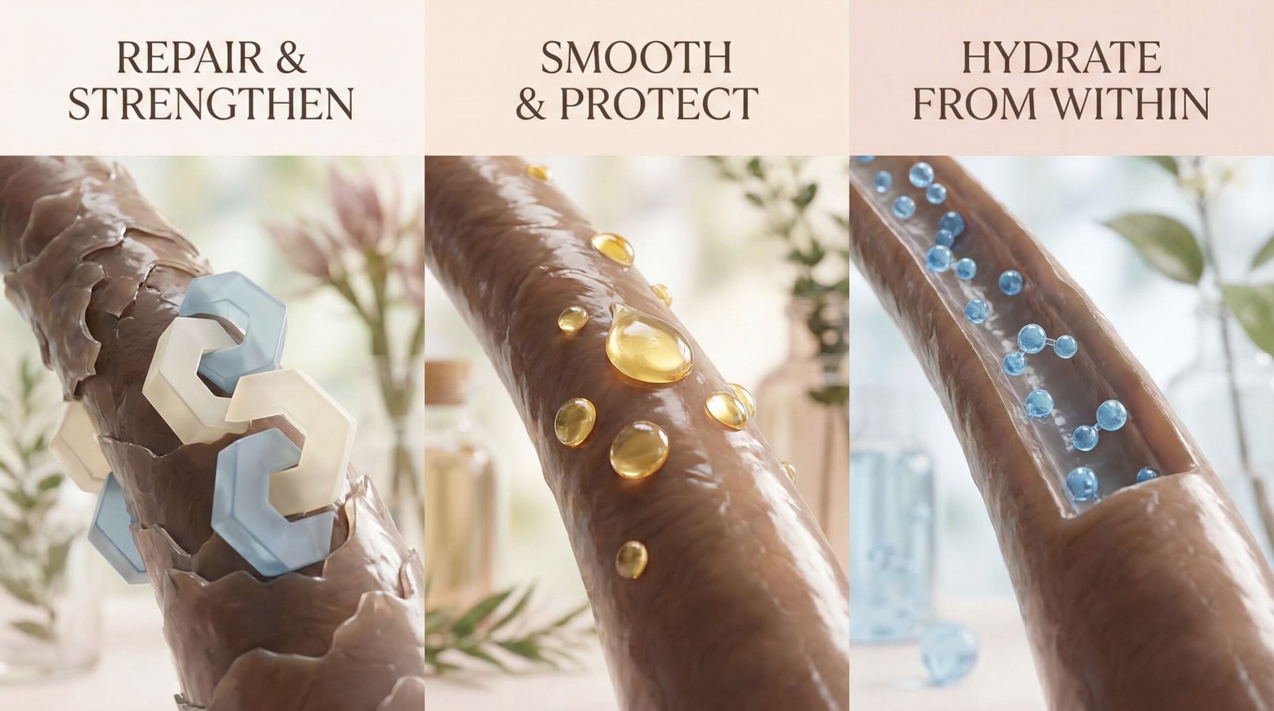 To filozofia oparta na dostarczaniu włosom trzech kluczowych grup składników w odpowiednich proporcjach, niczym zbilansowana dieta dla organizmu.